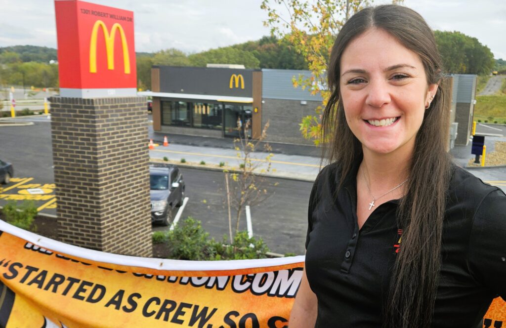 Hower’s connection to McDonald’s stretches back to childhood. Her parents, John and Kathleen Santonastasso, met as crew members, and she remembers listening to corporate conference calls on the way to softball tournaments. After graduating from college in 2018, she joined the family business full-time, helping manage an organization that has since grown to include 28 restaurants across Western Pennsylvania.