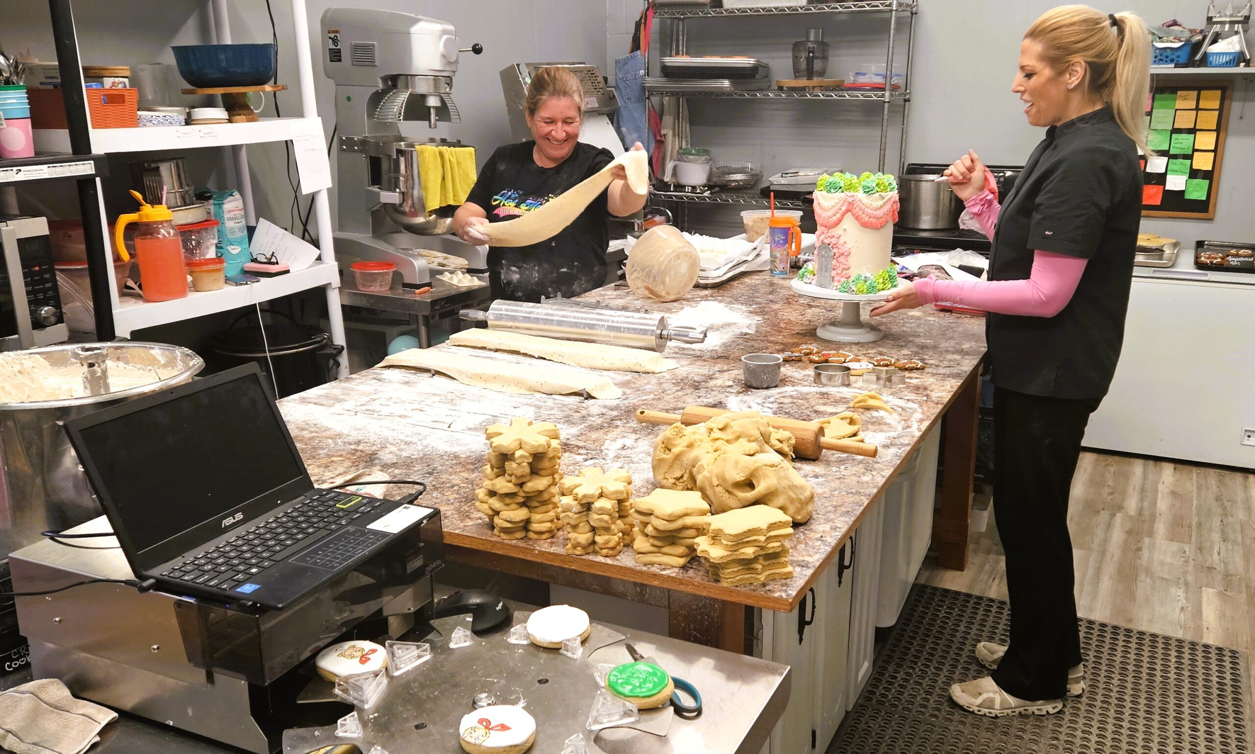 BeBe Kakes  is known for custom cakes, wedding cakes, donuts, cupcakes, and especially cookies. During the Christmas season, the workload reaches staggering levels: between 8,000 and 10,000 cookies baked fresh, never frozen.