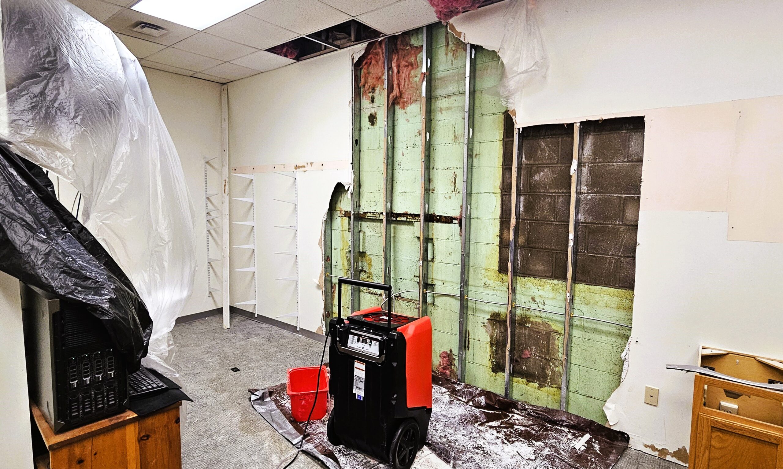 Professional restoration crews were brought in to begin drying the building using industrial fans, dehumidifiers, air scrubbers, and air movers. Multiple contractors are now assisting with mitigation and planning next steps, which will include replacing drywall, insulation, and ceiling tiles.